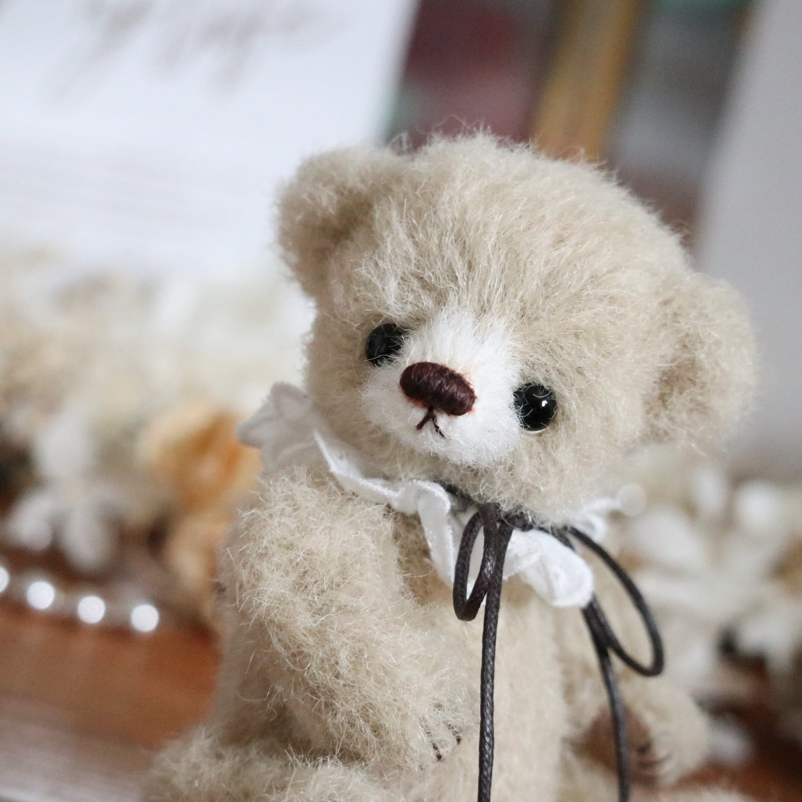 ピーチブラウンカラーのちびベアちゃん 手のひらサイズでお出かけにも連れて行きやすいサイズのベアちゃんです。 *サイズはたっちして約11.5cmです。 お座りで約9.5cm(多少の誤差はお許しください) *モヘア・スエード *ポリエステル綿・ステンレスボール *ブルーグラスアイ*キラキラ加工 (白目オーブンクレイ) *5ジョイント(首のみダブルジョイント) *爪の刺繍 *リボン *月のチャーム *星型のクッション *しっぽもついております *お誕生日 2026.3.10 ピーチブラウンカラーのモヘアでお作りしたちびベアちゃんです おめめはブルーのグラスアイを使用していて、キラキラ加工もしておりますので光の具合などで色々楽しめると思います。 リボンは結んでるので取り外せますが、チャームは糸を短めに結んでるので外す場合は糸をお切りいただいた方がいいと思います。 星型のクッションも付いております。 持たせてみたり寝ころばせて枕にしたり、一緒に飾っていただければと思います!